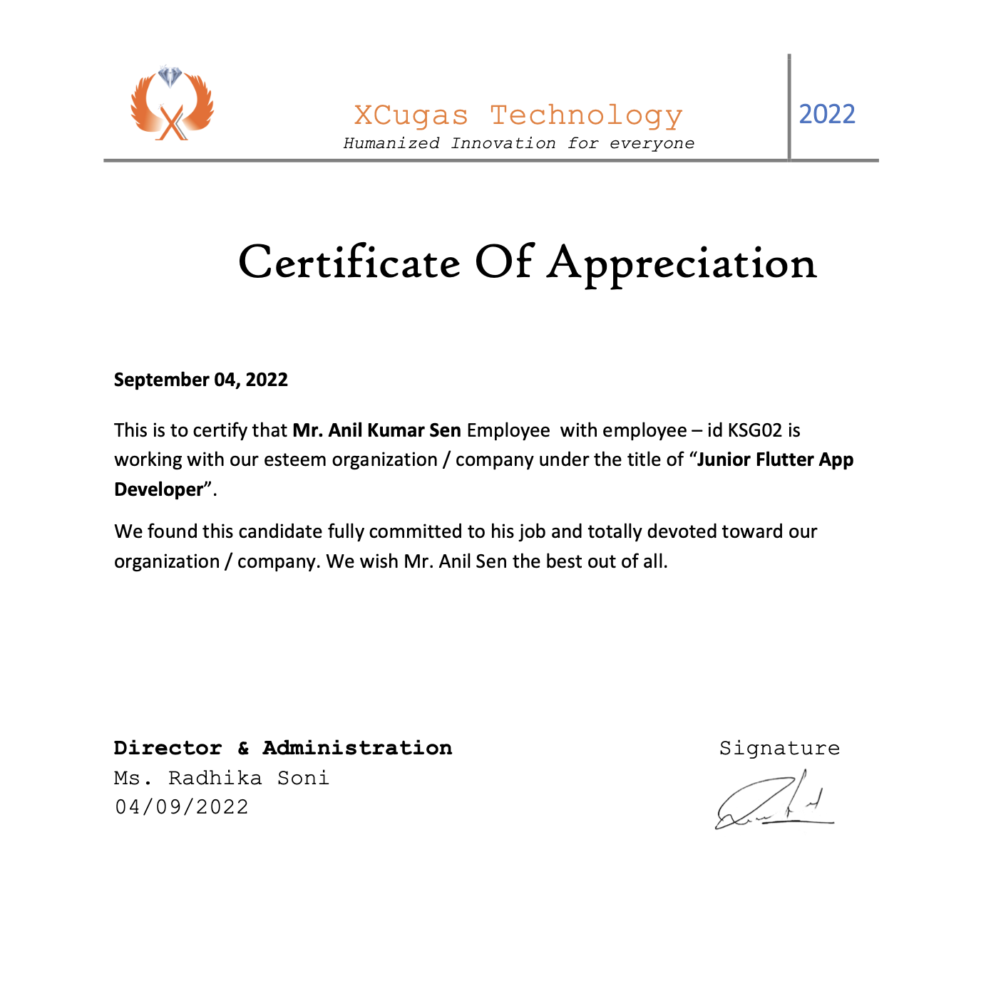 Xcugas Technologies — Junior Flutter Developer (Nov 2021 – Oct 2022, Kishangarh)